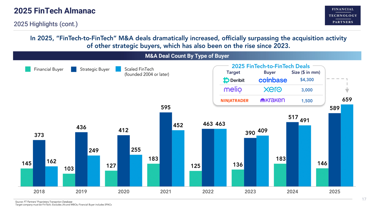 For the first time ever, scaled FinTech companies (those founded 2004 or later) made more FinTech acquisitions than other strategics (banks / FIs, legacy tech / FinTech players, etc.).