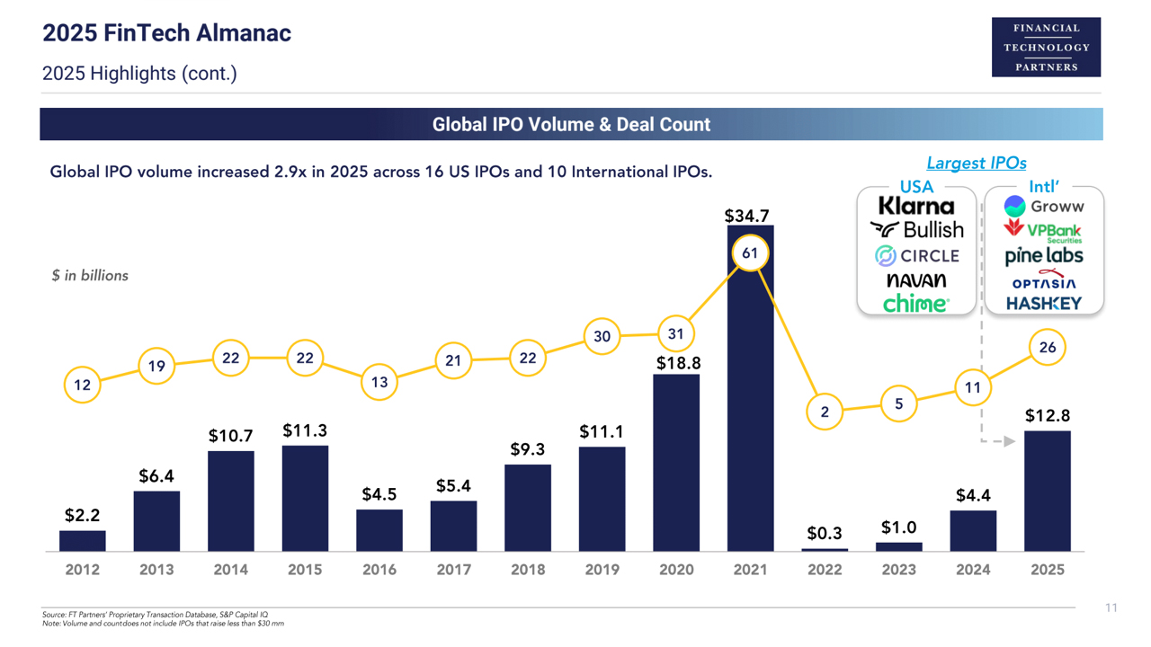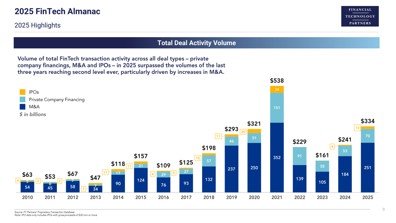 2025 and historical FinTech financing, IPO and M&A volume and deal count statistics