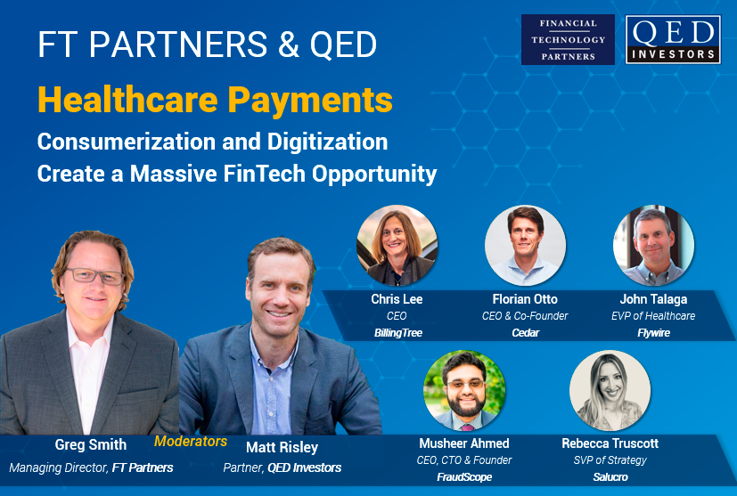 On September 15, 2020, FT Partners and QED Investors jointly unveiled an in-depth industry research report on Healthcare Payments during a live panel discussion with CEOs and executives. Greg Smith of FT Partners and Matt Risley of QED briefly introduce the report before diving into discussion topics around digitization and consumerization of the U.S. healthcare industry and the resulting emerging FinTech solutions for insurance companies, healthcare providers, employers, and patients. The panel features executives from BillingTree, Cedar, Flywire, FraudScope, and Salucro.